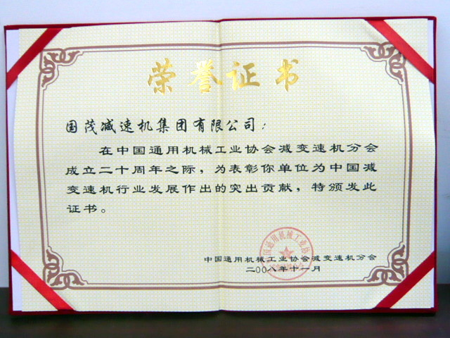 2008年,獲得中國(guó)減變速機(jī)行業(yè)20年發(fā)展“突出貢獻(xiàn)獎(jiǎng)”